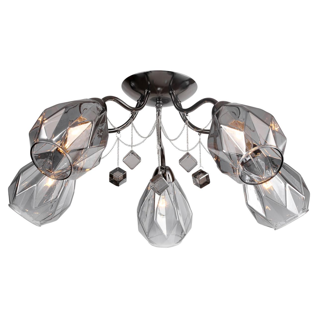 Потолочная пятирожковая люстра с направленными под сорок пять градусов гранеными плафонами изготовленными из тонированного кварцевого стекла. Сочетание черной стали и тонированного стекла признак хорошего тона для помещениий оформленных в темных тонах.