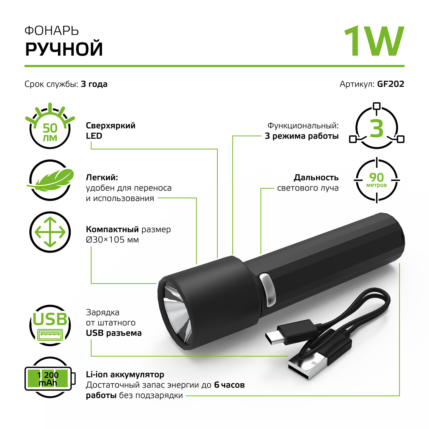 Фонарь ручной Gauss модель GFL202 с 3 режимами работы имеет компактный размер, легкий вес и удобен для ношения в кармане одежды или рюкзака. При этом у фонаря большая 90м дальность светового луча, которую обеспечивают сверхяркие 50лм LED светодиоды. Фонарь оснащен встроенным Li-ion аккумулятором, полного заряда которого хватает для обеспечения 6 часов непрерывной работы. Способ зарядки - от USB, в комплект входит шнур для USB разъема. Фонарь имеет универсальное назначение.