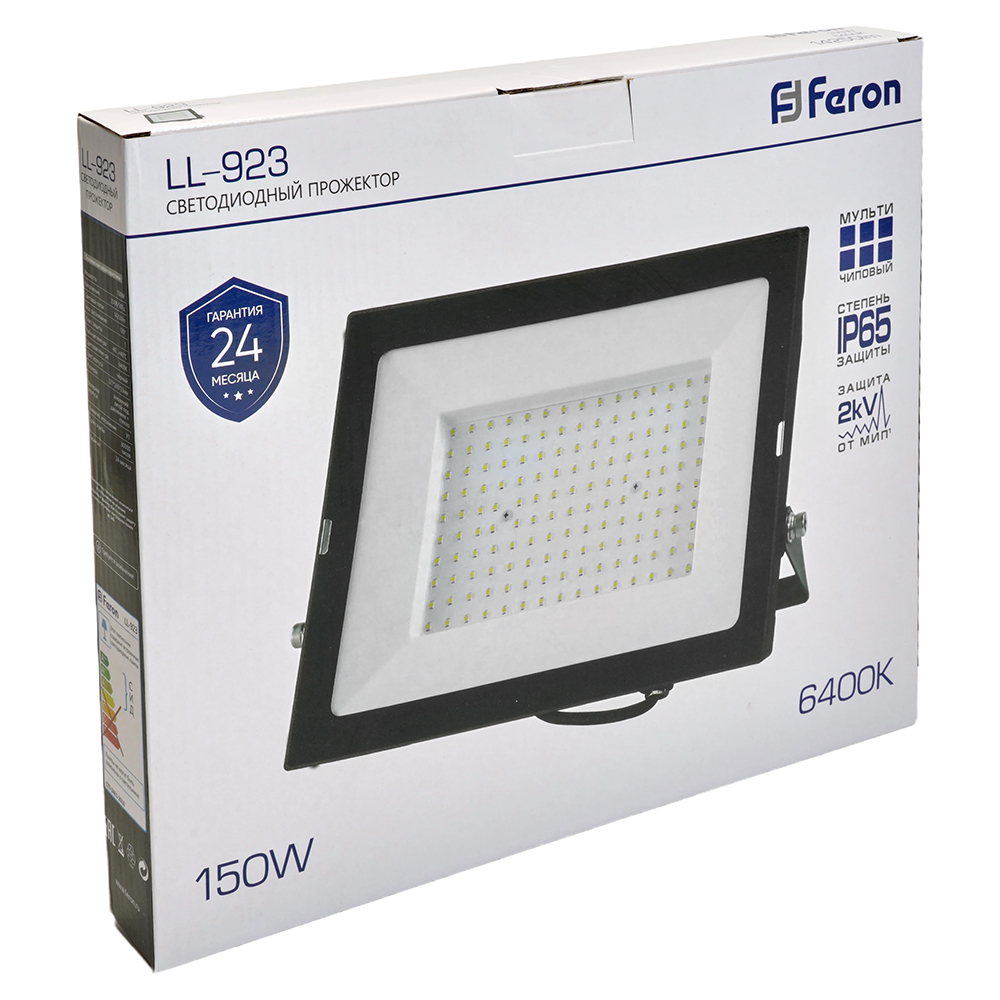 Прожектор светодиодный многоматричный с монтажным креплением на кронштейн, (ДО) FERON LL-923, 150W, 6400К (холодный белый), 230V/50Гц, 15000Lm, IP65, угол рассеивания 120°,*SMD2835, раб.t -40°C - +40°C, цвет чёрный, корпус алюминий литой под давлением + стекло, 327*265*33 мм