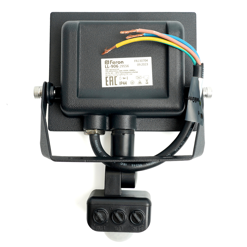 Прожектор светодиодный многоматричный с монтажным креплением на кронштейн, с инфракрасным датчиком движения (ДО) FERON LL-906, 20W, 6500К (холодный белый), 175-265V/50Гц, 2000Lm, IP44, угол рассеивания 120°,*SMD2835, раб.t -40°C - +40°C, цвет черный, корпус алюминий литой под давлением + стекло, 126,5*145*71 мм