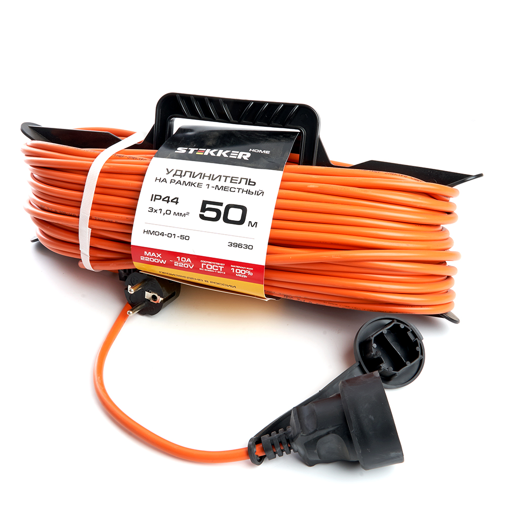 Удлинители STEKKER HM02-01-50, серия Home, цвет оранжевый, длина 50 м, количество розеток 1, латунь, сечение кабеля 1 мм2, тип кабеля ПВС, материал кабеля медь, ток 16А, напряжение 220В, максимальная нагрузка 2200Вт, тип вилки - угловая. Диапазон рабочих температур  +1..+35°C, степень защиты IP44, класс защиты от поражения эл. током 1, размеры изделия 380*140*135. Гарантия 2 года.