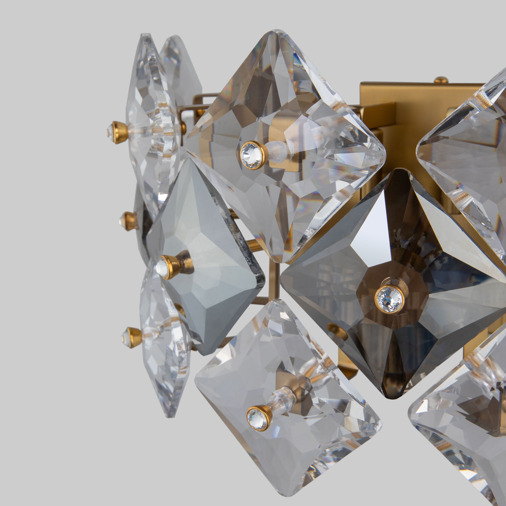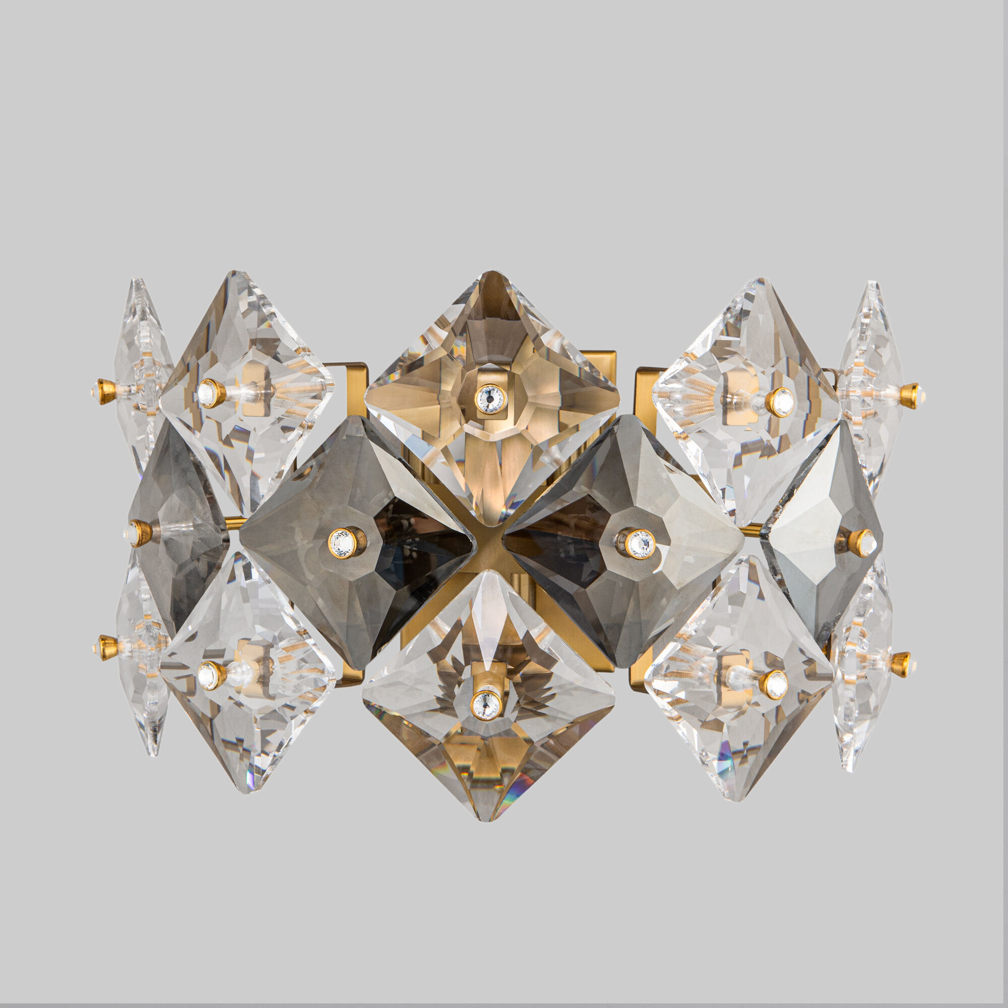 Rubis — элегантный светильник, наполняющий пространство роскошью. Изысканная арматура цвета латунь усеяна хрусталем Strotskis, который привносит атмосферу торжества и изысканности. Сочетание дымчатого и прозрачного хрусталя строгой геометрической формы добавляет акценты в интерьер. Лучи света, попадая на хрусталики, создают оригинальную игру света и бликов.