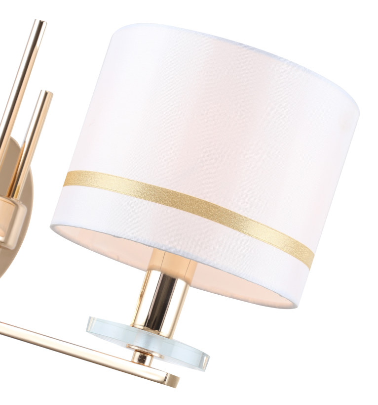 Светильник настенный из коллекции Chart / Чарт выполнен из металла, гальванизированного в цвет золота, и декорирован железными стержнями в цвет арматуры. Текстильный абажур белого цвета с термостойким акрилом внутри отделан кантом в цвет арматуры. Декоративная розетка выполнена из прозрачного стекла.
