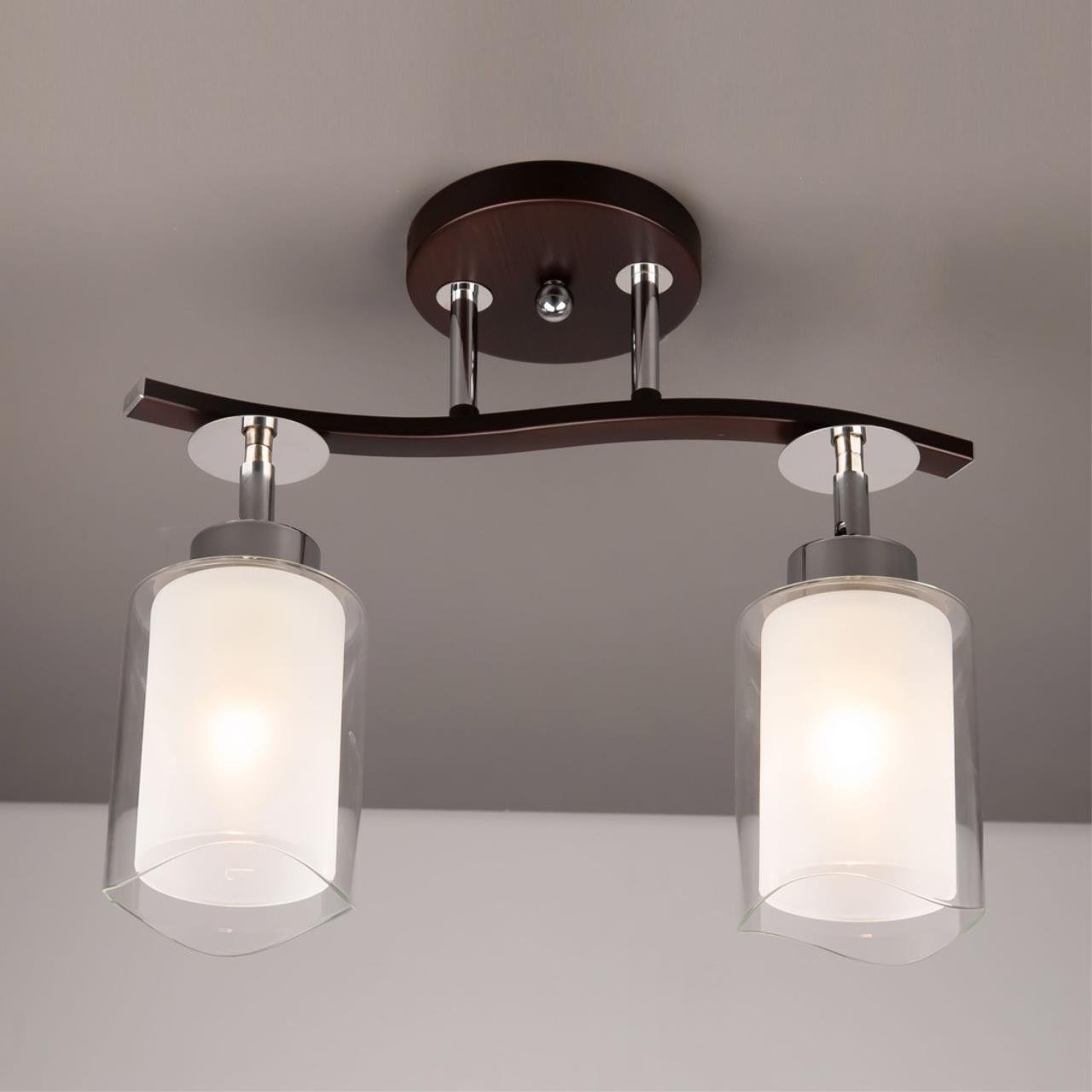 Потолочный светильник коллекции Фортуна на 2 рожка выполнен в цвете венге с декоративными хромовыми элементами. Плафоны оснащены поворотным механизмом, что позволяет зафиксировать их в любом положении. Это технологическое решение даёт возможность изменить дизайн светильника, а также оптимально распределить освещение в помещении. Цоколь патрона Е27 с ограничением по мощности для ламп накаливания до 75 ватт, светодиодные лампочки можно ставить любой мощности. Плафоны выполнены из стекла, наружное прозрачное, а внутреннее белое матовое. Каркас люстры сделан из металла. Площадь освещения до 7 квадратных метров. Тип крепежа: потолочный. Размер: Длинна: 37см, Высота: 25 – 33 см, Ширина: 13 см.